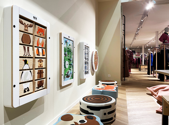 本次 Dirk De Wit Mode 与 IKC 携手合作,共同打造了一个高效、可持续的儿童区。配备互动墙面游戏模块、桦木身高尺及软体坐垫,既环保安全,又同样富有趣味性,为孩子们提供了纯粹的快乐体验。